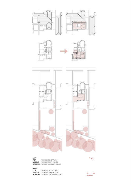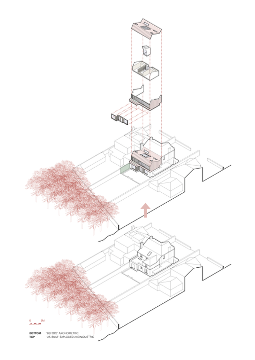 Downstairs, openings to the garden were enlarged and brought up to a raised ceiling. The porch was closed in; window reveals provide depth for seating. Internal door openings were also raised.