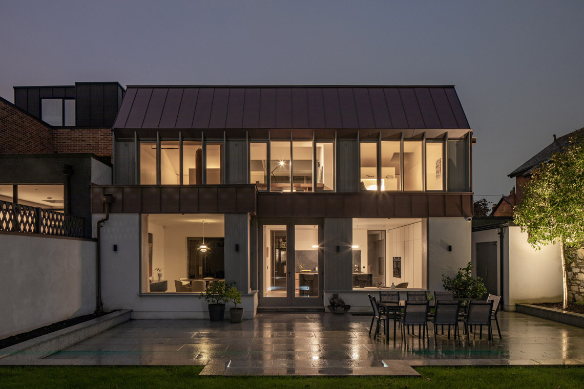 We extended over part of the ground floor flat roof. The new works were capped with an asymmetrical, sloping zinc roof; the colour tying in with the existing brickwork. The form provides voluminous space, while respecting the scale of the original house and not oversailing the ridge.