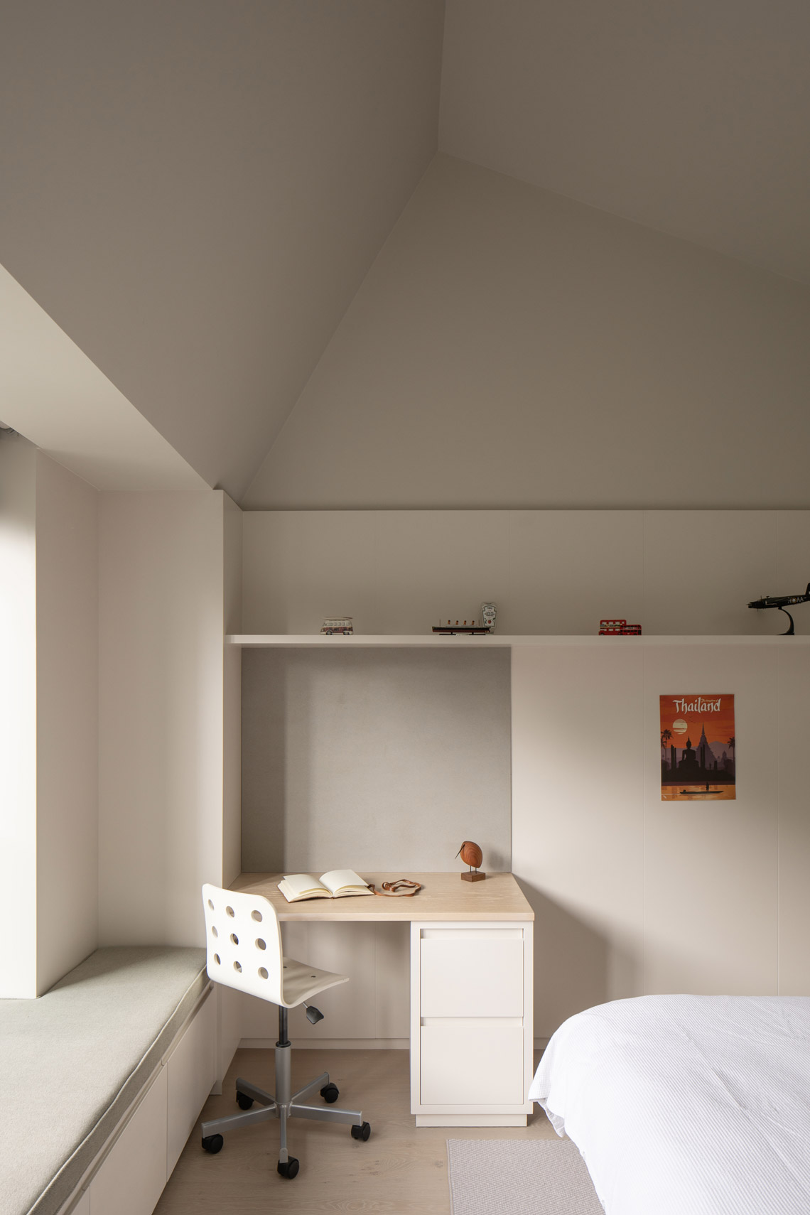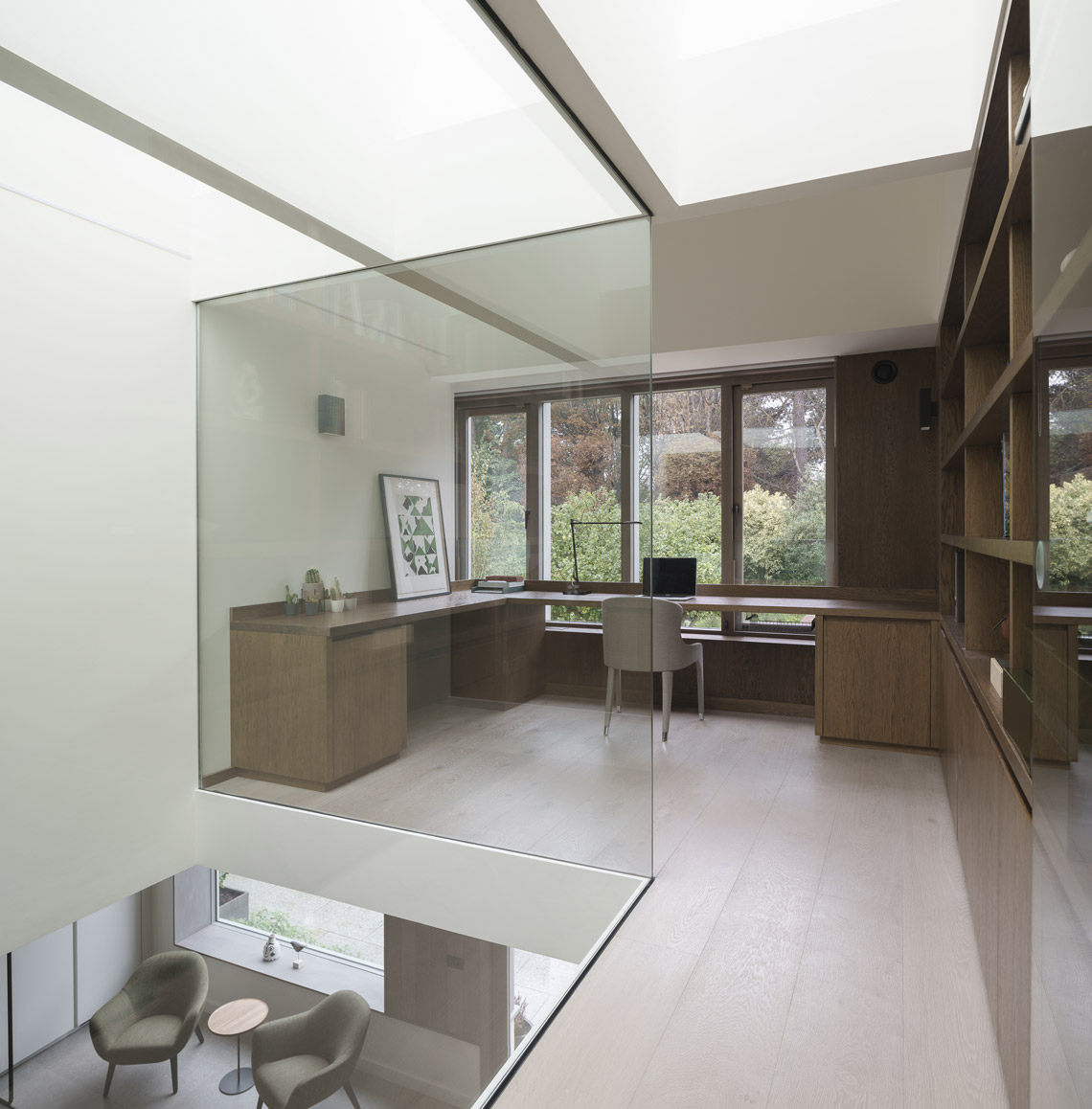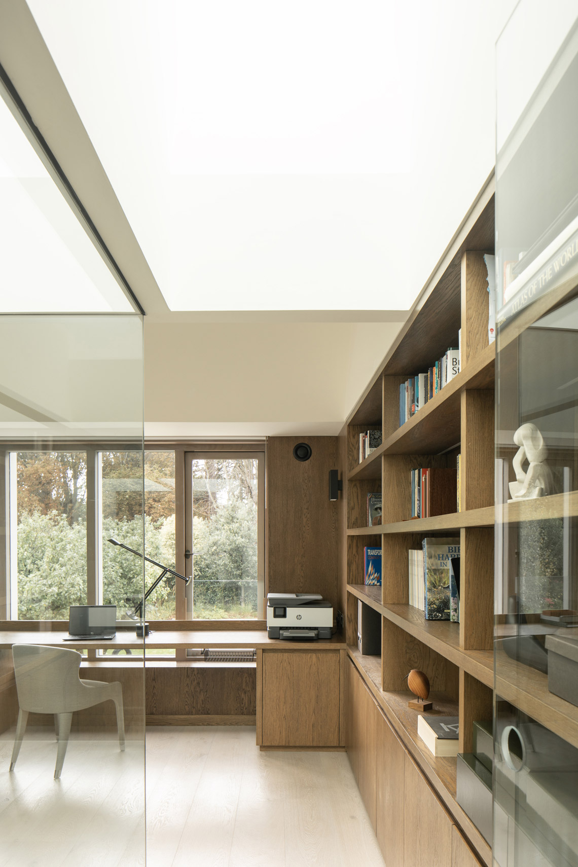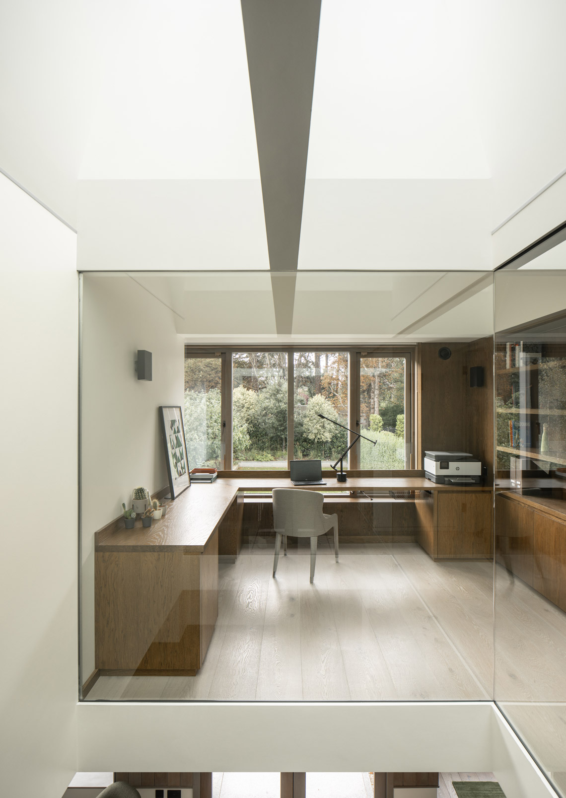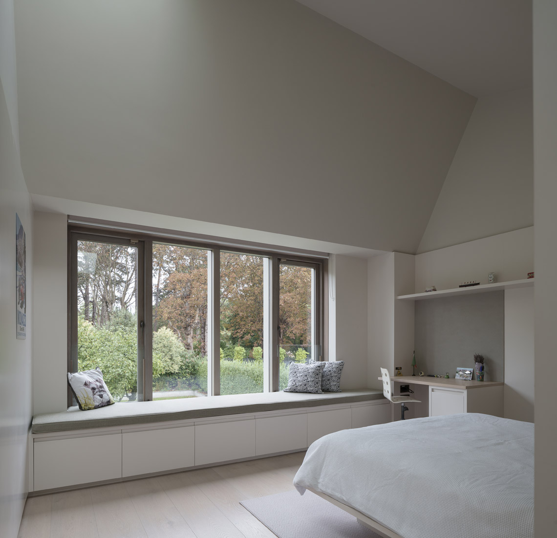 A bedroom and a second guest bedroom / gym were provided on either side of the office. A horizontal datum focuses views towards the trees and horizon. Above, ceilings slope to create interesting volumes, with discreet roof-lighting at corners. Interiors are lined with panelling and built-in joinery. Windows are brought down to seat level. The main bedroom was designed to provide a calm, safe, sensory environment; a retreat for a family member.