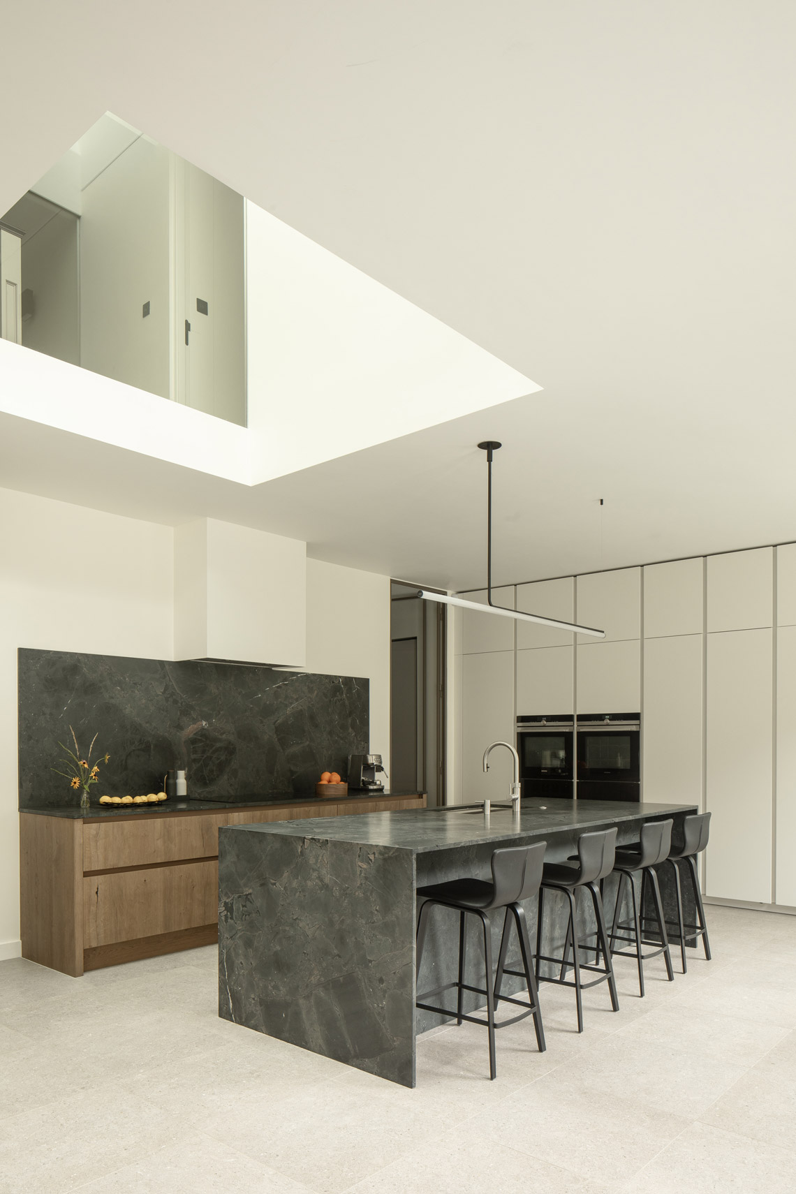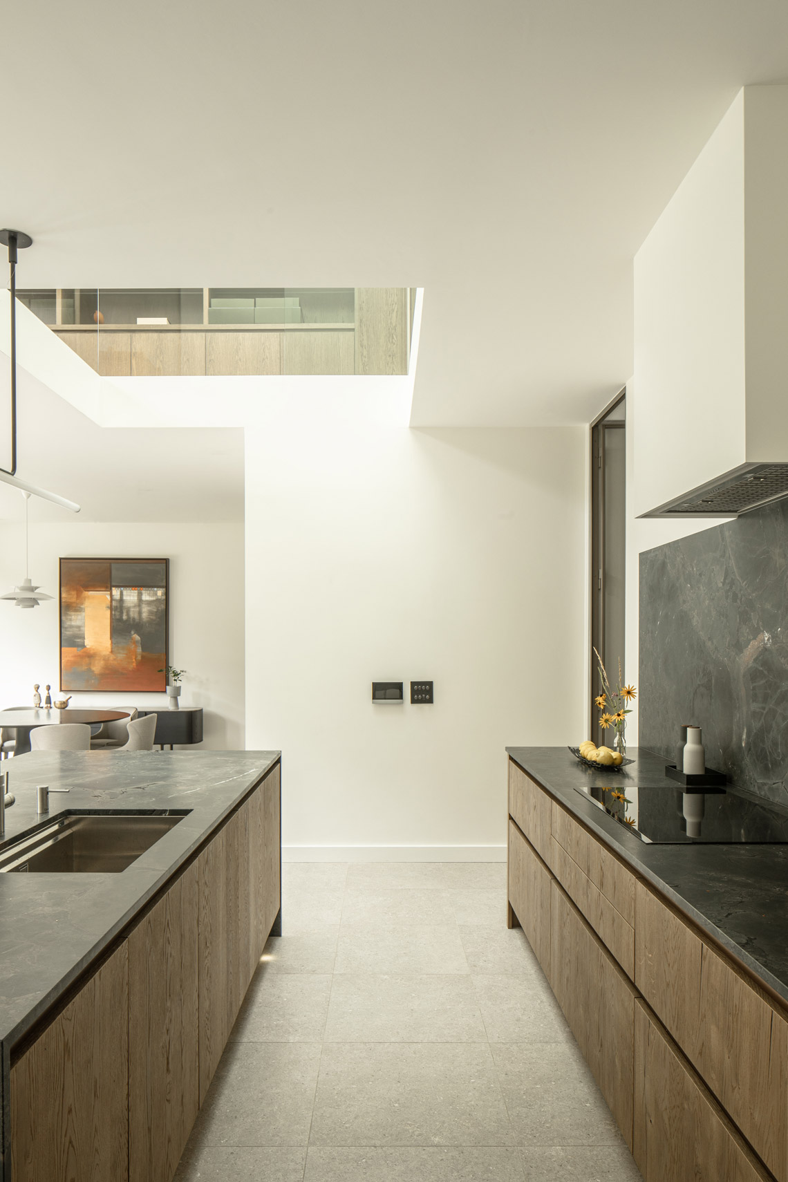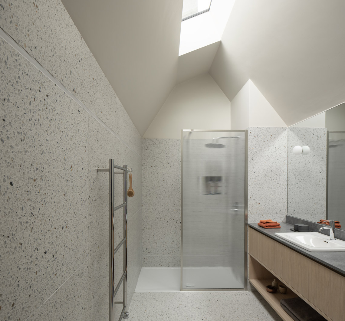 Internal lighting studies were undertaken. The double-height void links the kitchen-dining room to the first floor, capped by roof-lights. This increases light to the ground floor, especially required as a rooflight was being removed. It also provides visual connections to the new home office, and increases volume and height.